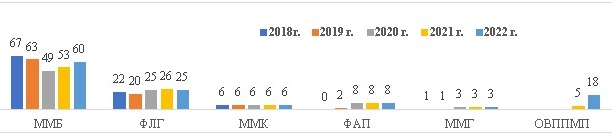 Рис. 3. Распределение подразделений для выездных форм работы по типам в 2018–2022 гг. (ММБ – мобильные медицинские бригады, ФЛГ – флюорографические установки, ММК – мобильные медицинские комплексы, ФАП – фельдшерско-акушерские пункты, ММГ – маммографические установки) в Волгоградской области в 2018–2022 гг.