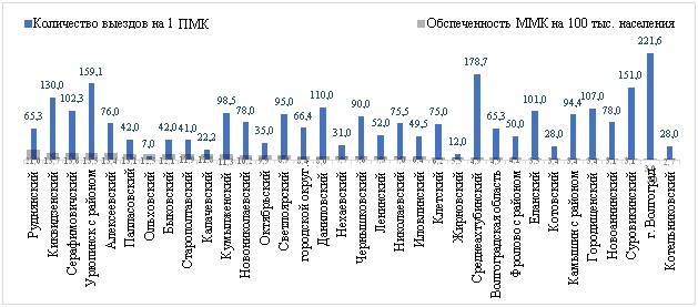 Рис. 5. Обеспеченность ПМК муниципальных образований Волгоградской области в 2022 г. на 100 тыс. населения в соотношении с количеством выездов на 1 ПМК