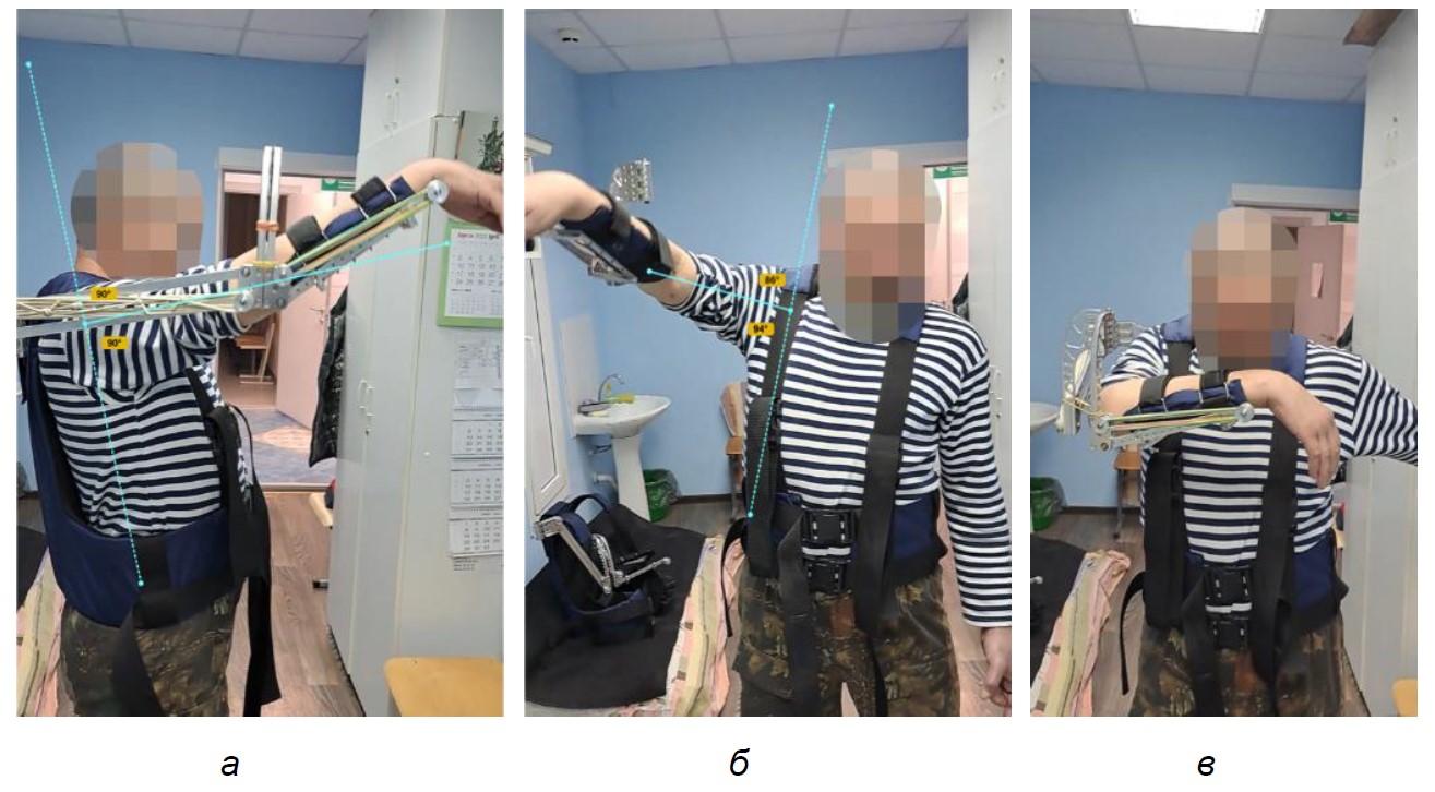 Уже при первом использовании экзоскелета удалось достигнуть сгибания в правом плечевом суставе до 90° (рис. 4а). Получено отведение правой верхней конечности – около 95° (с учетом движения лопатки) (рис. 4б). Сгибание правого предплечья – до 90° (рис. 4в). Значительно уменьшились боли при движении. Пациент, помимо занятий лечебной физкультурой в экзоскелете, получил возможность абилитационного эффекта, в частности пользоваться поврежденной рукой для выполнения бытовых функций – одевание, гигиеническтие процедуры и приема пищи.