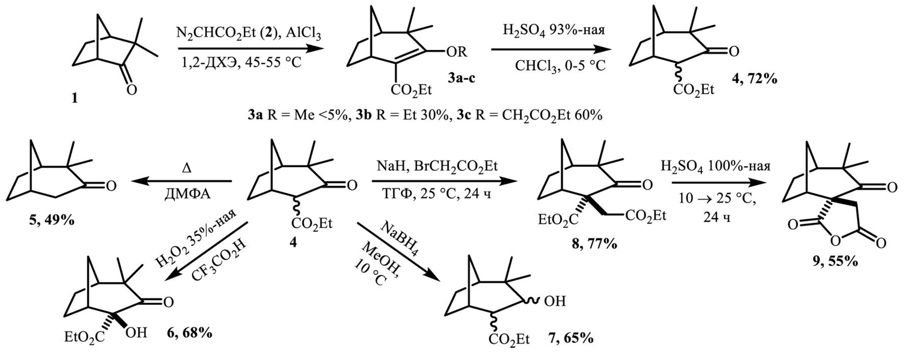 Результаты. Гомологизация для бициклических терпеноидов и родственных им соединений в литературе практически не описана, что представляет собой предпочтительное направление для дальнейшего изучения. На примере взаимодействия камфенилона (1) с этилдиазоацетатом (2) в присутствии AlCl3 удалось получить продукты расширения цикла 3a-c. При гидролизе смеси эфиров енола 3a-c образуется β-кетоэфир 4, для которого были изучены некоторые химические свойства. Были получены α-замещенные производные 6, 8, а также β-гидроксиэфир 7 и гомокамфенилон 5, которые являются перспективными субстратами для изучения перегруппировок по типу Вагнера–Меервейна. В результате взаимодействия диэфира 8 со 100 % серной кислотой образуется спироциклический ангидрид 9, вместо предполагаемого продукта перегруппировки (рис. 1).