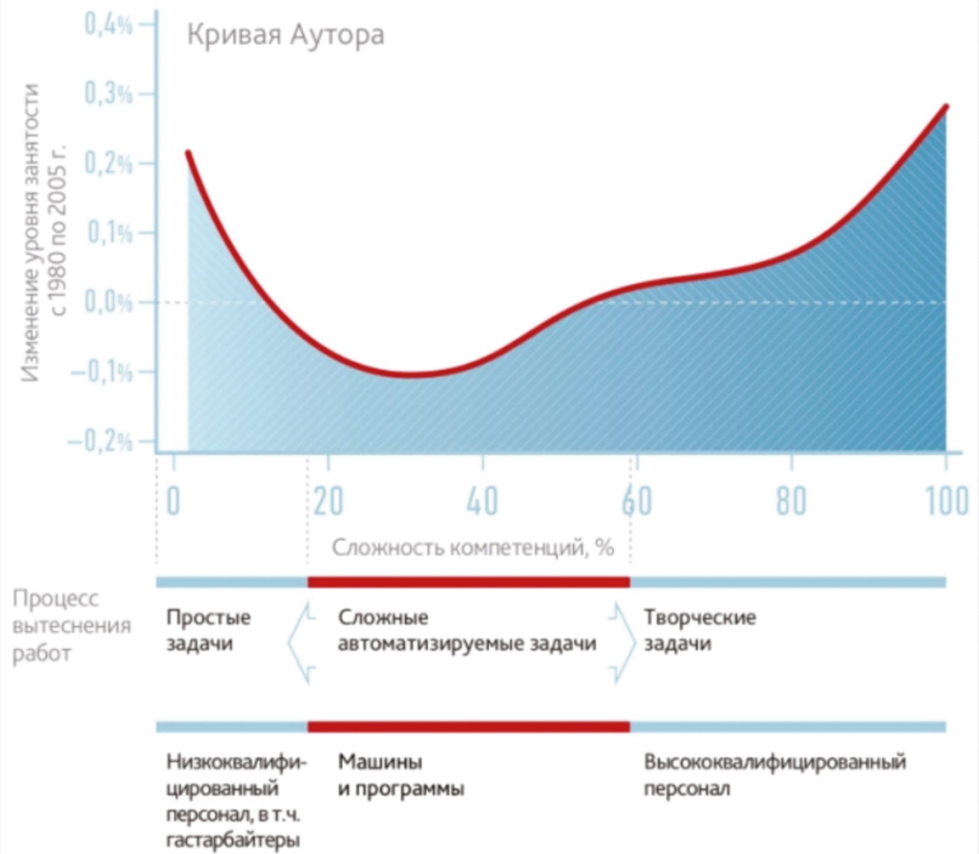 - Анализ на примере кривой Аутора [7] демонстрирует, что текущая ситуация подтверждает тенденцию. Эта тенденция — эффект цифровой трансформации. Так называемые «белые воротнички» под ударом, их первых смоет цифровой революцией. Так как растет занятость среди низко- и высококвалифицированных работников, при этом сокращается занятость среди работников средней квалификации.