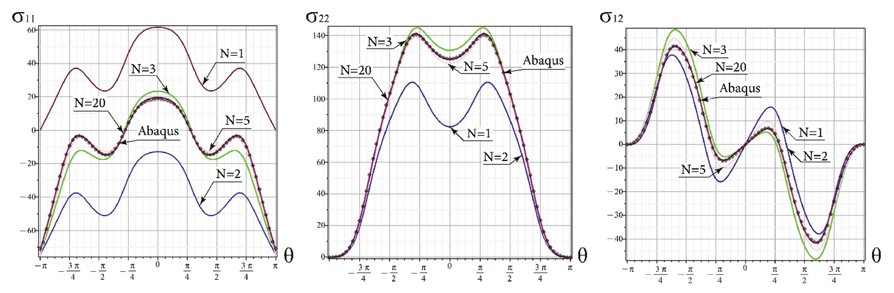 На рис. 3 представлены угловые распределения напряжений правой трещины в окрестности левой вершины в пластине с двумя коллинеарными трещинами при нормальном отрыве, полученные на основе многопараметрического разложения (1), ограниченного разным числом членов ряда. Асимптотическое разложение (1) обеспечивает сходимость ряда в пределах радиуса сходимости. При этом анализ ошибки, допускаемой при усечении ряда с удержанием различного числа слагаемых, показывает, что усеченные ряды также способны точно описывать поля напряжений с увеличением количества удерживаемых слагаемых. Это свойство иллюстрируется графиками угловых распределений напряжений на рис. 2, где сопоставлены результаты последовательных усеченных решений для напряжений с данными, полученными методом конечных элементов.