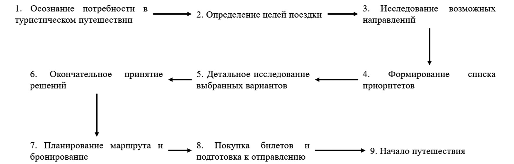 Методы. Исследование, проведенное среди более ста жителей Самары и Самарской области, показало, что каждый второй опрошенный назвал Казань первым российским городом, ассоциирующимся с туризмом. Официальные данные и исследования также подтверждают постоянное попадание Казани в число лидеров по числу посещений туристами [4]. Успех Самары как туристического направления обусловлен пониманием процесса принятия решений туристами. Для визуализации был разработан маршрут потенциального туриста, отображенный на рис. 1, охватывающий весь путь от возникновения идеи путешествия до прибытия. Проблема возникает уже на этапе исследования возможных направлений. Ошибки на этапе № 3 оказывают негативное каскадное влияние на последующие этапы.