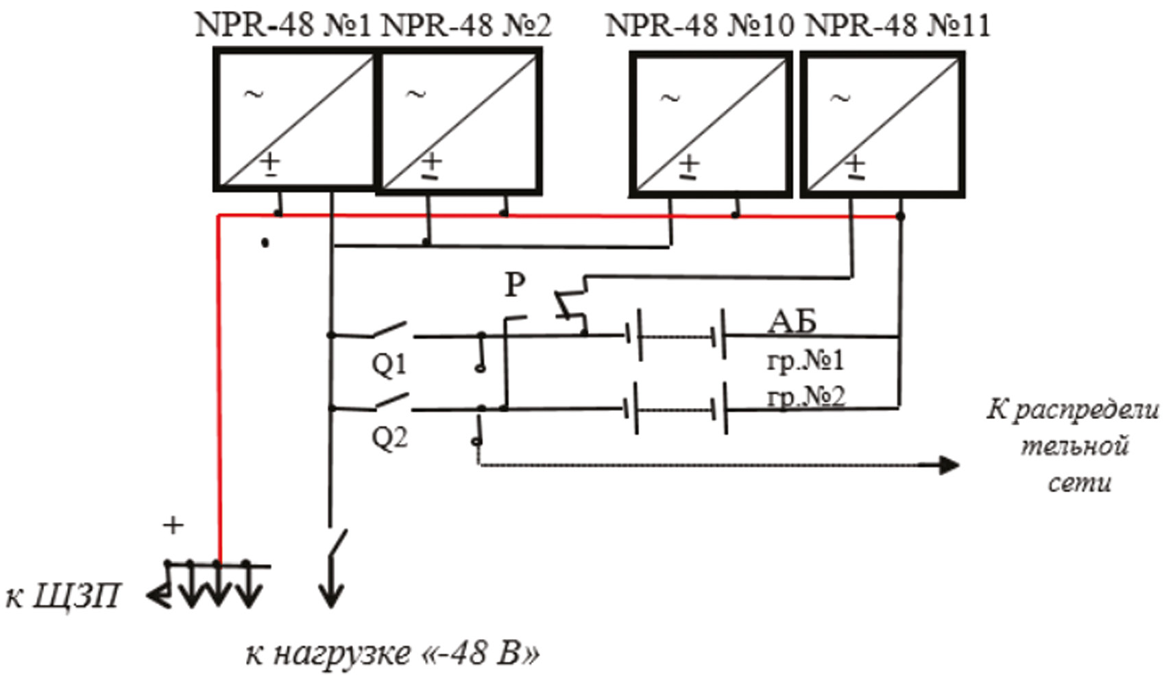 Результаты. Как видно из рис. 1, 11 выпрямительных модулей работают параллельно на общую нагрузку, а 1 является резервным. Двухгруппная аккумуляторная батарея подключена параллельно к шинам постоянного тока. Модульная конструкция позволяет изменять размеры системы в зависимости от необходимой мощности. Также в электропитающих установках предусмотрена защита от перегрузок и коротких замыканий в виде предохранителей, автоматических переключателей или реле.