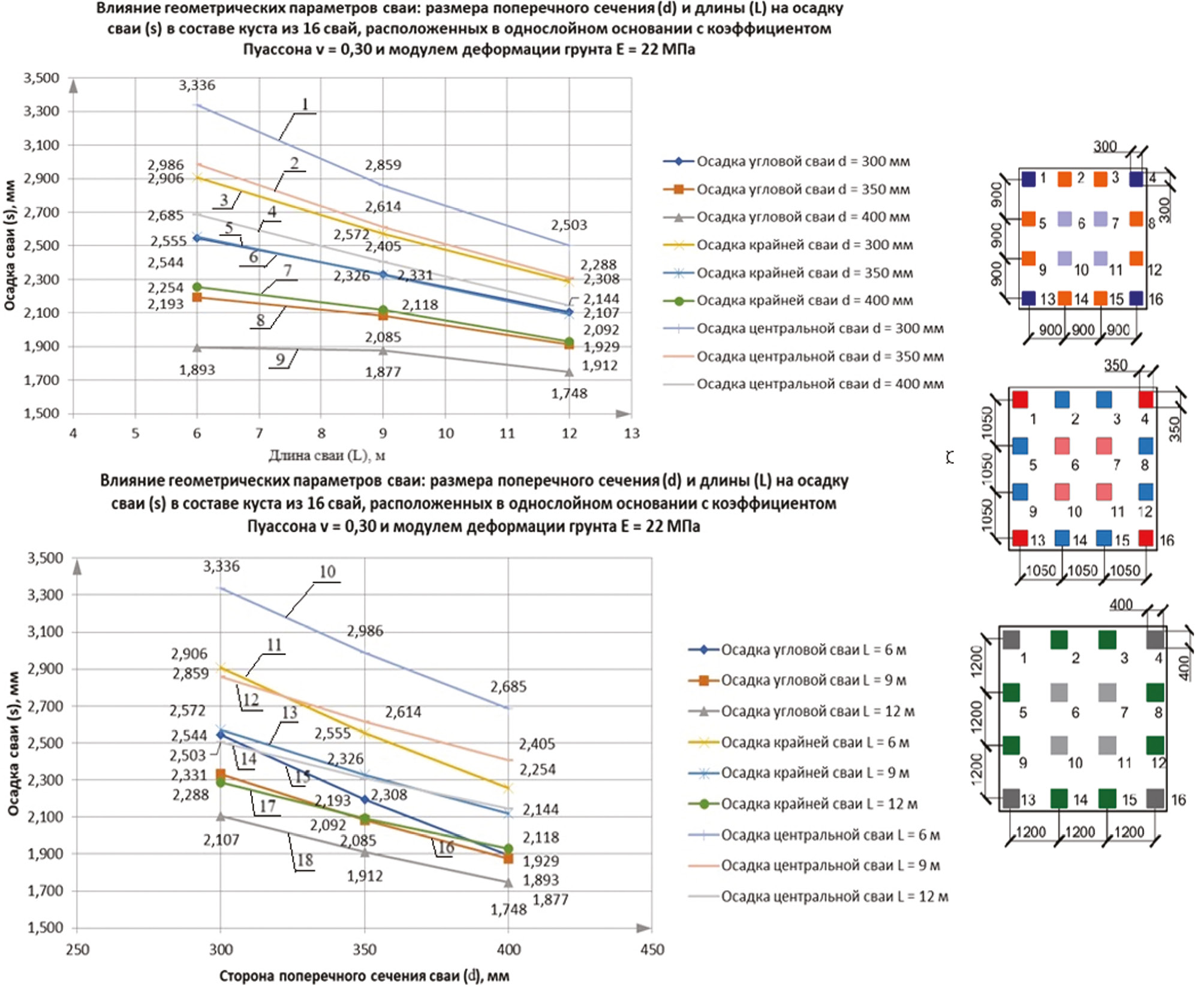 Результаты численного моделирования осадок сваи при увеличении длины сваи (графики 1–9) и размера поперечного сечения сваи (графики 10–18) представлены в табл. 1.
