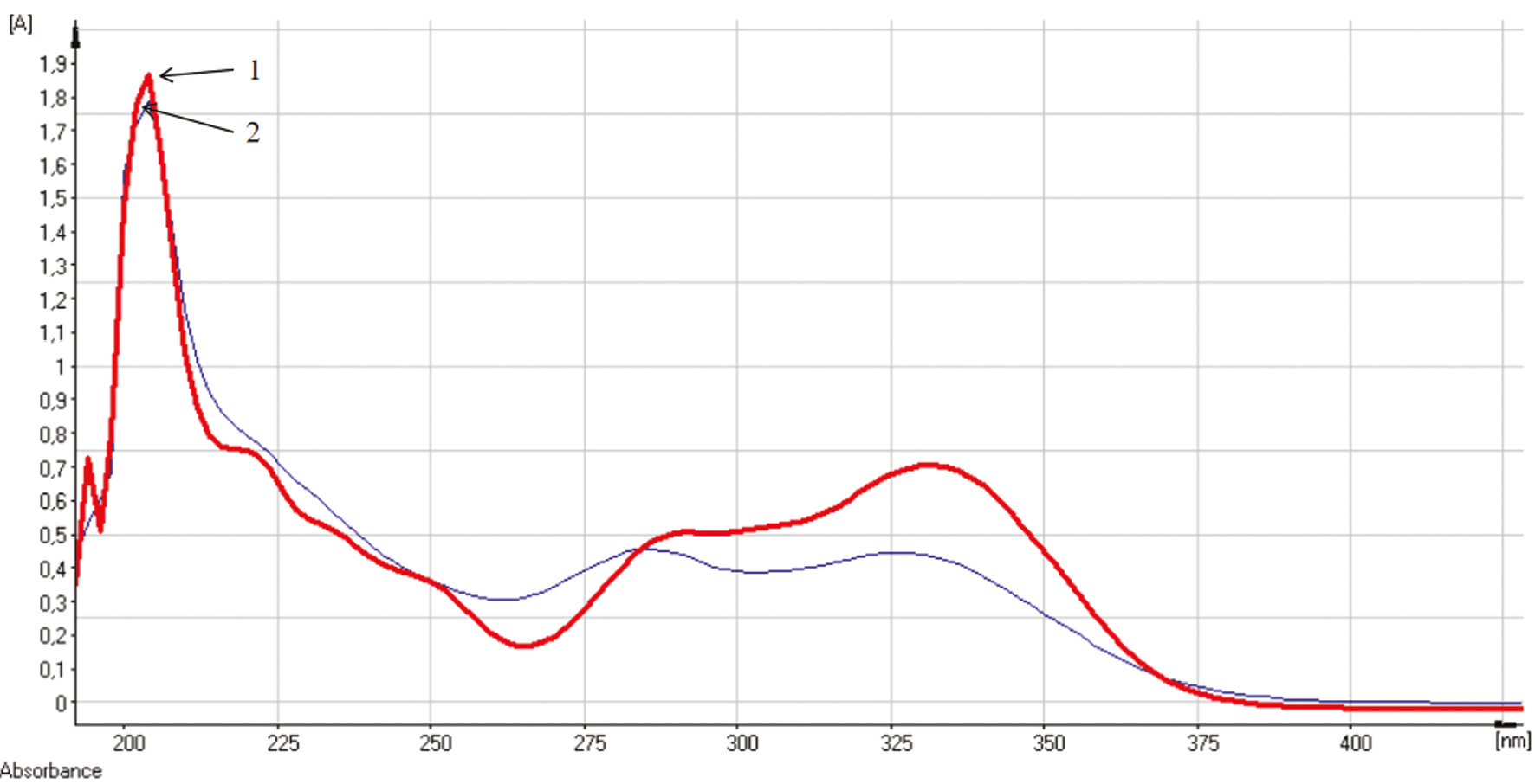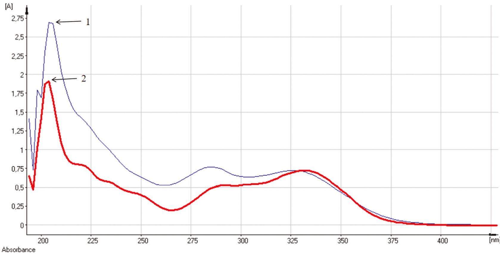 Рис. 2. Электронный спектр густого экстракта на 70 % этиловом спирте: 1 — густой экстракт на 70 % этиловом спирте; 2 — спиртовой раствор стандартного образца розмариновой кислоты