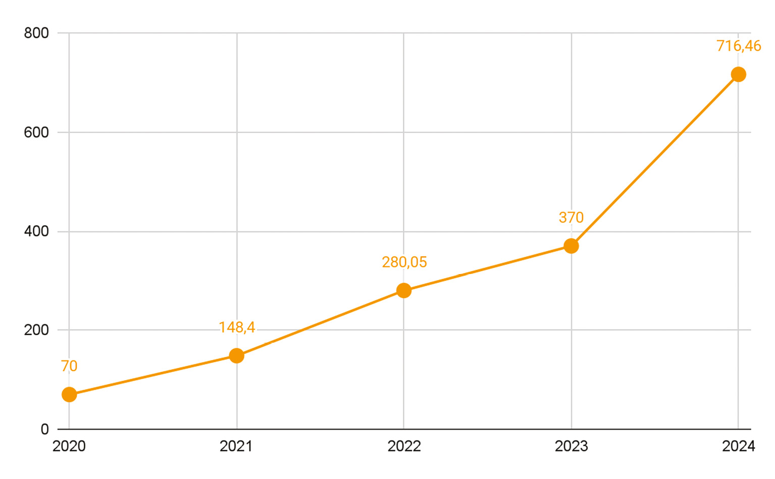Рис. 1. Динамика размеров займов ГФРП СО на развитие промышленного производства, млн руб. [1]