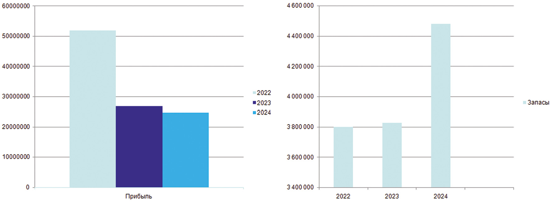 Результаты. Для более детального анализа рассмотрим динамику основных показателей ПАО «НГК «Славнефть»: выручки и себестоимости (рис. 1), а также величины прибыли и запасов (рис. 2) [6].