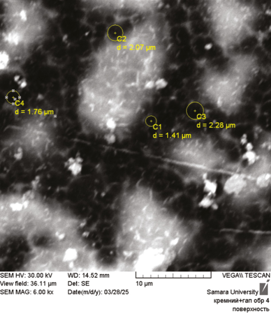 Результаты. Толщина пористого слоя составила 10–12 мкм, пористость составила 24–36 %. При РЭМ-исследовании образца, время травления которого составило 25 мин, было обнаружено подобие упорядоченной структуры, внутри которой были выявлены поры. Предполагаемая гипотеза: данная структура образует «второй порядок пористого слоя» (рис. 1).