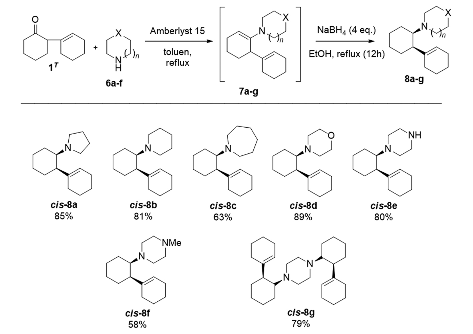 Предположив возможность специфической сольватации интермедиата электронодонорным растворителем (Et3N), а также с учетом малого размера NaBH3CN, нами был разработан транс-диастереоселективный метод получения вторичных аминов (рис. 2). В связи со сложностью метода, представлено три примера синтеза вторичных аминов транс-конфигурации.